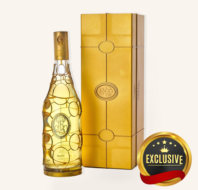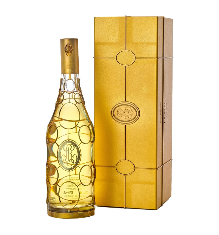 Each Bottle Is A Jewel - A veritable technical feat that requires great expertise and is inspired by the tradition of jewelry making, Louis Roederer’s medallion bottle is comprised of 24-carat gold open latticework. The 2002 cuvée has a jewel-like appearance, revealing its many facets through the many reflections created by this sensual and eternal powdered gold openwork covering. Each medallion bottle is 100% handcrafted, requiring the craftsmanship of 2 master goldsmiths, 7 meters of brass strip plated in 24 carat gold, 158 silver soldering points, and 4 days of work. Precise, silky, and harmonious with a rich, powerful body that has a very pure balance and incredible ageing potential. It is a taut and delicate wine. It displays a pure, precise combination of sweet flower, cocoa, finely roasted hazelnuts, and candied citrus fruit. The texture is infinitely silky, concentrated, and flavorsome, with an explosion of ripe fruits, red fruits, white chocolate, caramel, and pastries that is typical of Cristal. Only produced in Jeroboam and in very limited quantities.