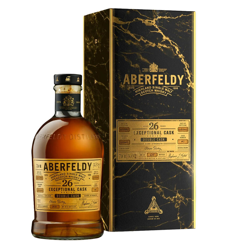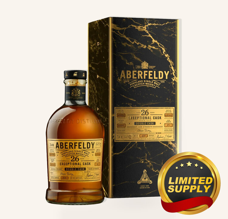 Aberfeldy 26 Year Old Exceptional Cask Series Double Cask Highland Single Malt Scotch Whisky is a rare and opulent expression from the heart of the Highlands, crafted with precision and passion at the historic Aberfeldy Distillery. Part of the highly esteemed Exceptional Cask Series—a collection of Single-Cask, Double-Cask, and small-batch releases—this whisky is carefully selected by Malt Master Stephanie Macleod for its remarkable character and depth. Aged for over two decades, this limited-edition release combines the richness of Aberfeldy’s signature honeyed style with the layered complexity imparted by its double maturation in Languedoc red wine casks and finished in Oloroso Sherry casks. With only 282 bottles produced, each individually numbered, this 26-year-old release is a testament to Aberfeldy's tradition of excellence and a coveted treasure for collectors and aficionados.
