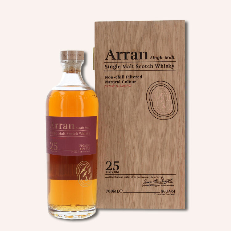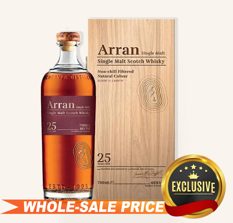 The Arran 25 Year Old Single Malt Scotch Whiskey—an enchanting and sultry dram that captivates with its deep flavor profile, adorned with tantalizing hints of vanilla and sweet caramel. The allure doesn't stop there; brace yourself for a long, smooth finish that lingers on the palate, leaving a trail of pure satisfaction.