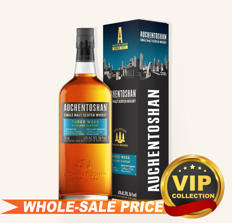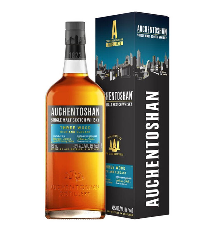 The award-winning Auchentoshan Three Wood Single Malt Scotch Whisky is matured in three distinct cask types: American Bourbon, Spanish Oloroso Sherry, and finally, Pedro Ximenez Sherry casks. This maturation process creates a rich, complex whisky with toffee and sherry flavors. It's versatile enough to make an excellent Auchentoshan & Ale, a superb Old Fashioned, or simply enjoyed neat.