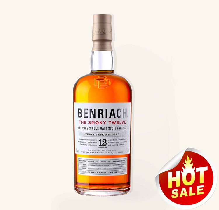 BenRiach The Smoky Twelve Three Cask Matured edition showcases the creative heritage of BenRiach, known for its layered style shaped by diverse cask selections. This twelve-year release is crafted from both peated and unpeated compositions, then matured across three distinct cask types—bourbon, sherry, and Marsala—before being unified into a harmonious expression. The result highlights BenRiach’s signature approach to depth, balance, and refined character, presenting a profile that is simultaneously smooth, creamy, and richly dimensional.