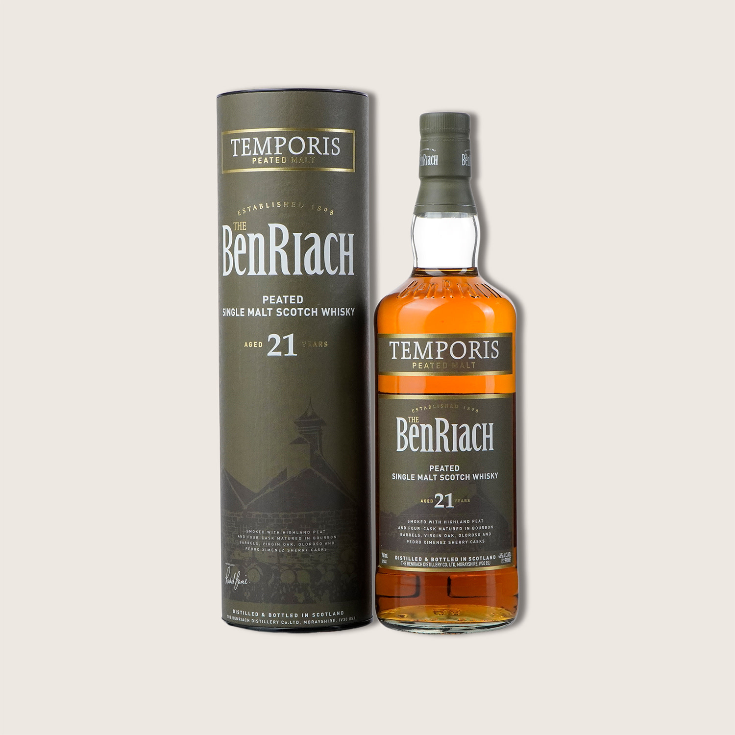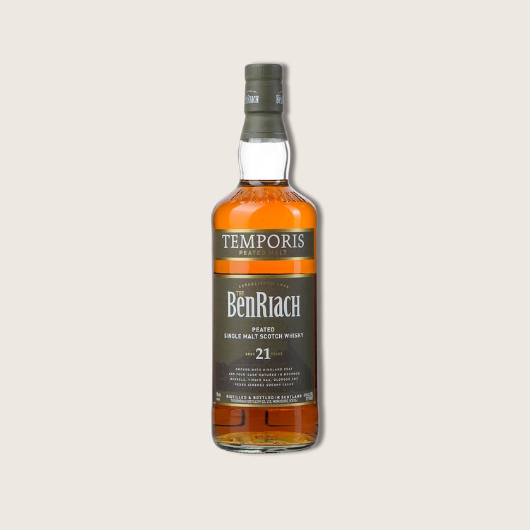 Meaning “time” in Latin, BenRiach 21 Year Temporis Peated Single Malt Scotch Whisky emulates the original character of Speyside malts in the 19th century. An eclectic mix of Bourbon barrels, virgin oak casks, Pedro Ximenez sherry and Oloroso sherry combine result in a multi-faceted peated malt.