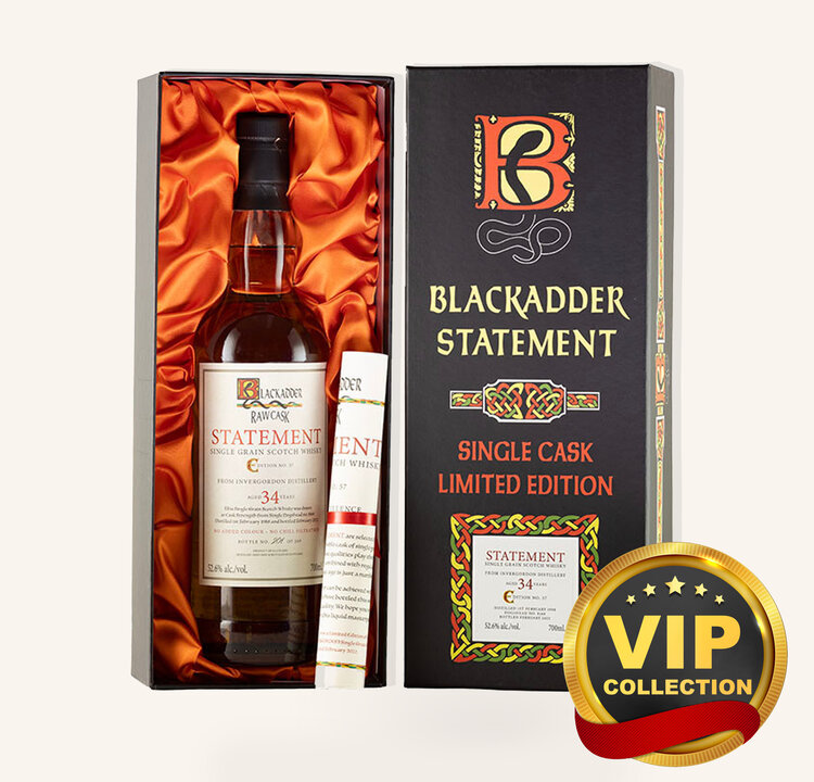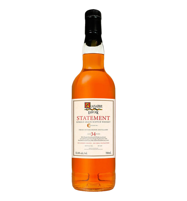 Blackadder Raw Cask Invergordon 34-Year-Old Statement Edition #57 is a rare and distinguished single grain Scotch whisky that exemplifies the independent bottler's commitment to authenticity and craftsmanship. Founded in 1995 by Robin Tucek and John Lamond, Blackadder is renowned for its "Raw Cask" series, which features whiskies bottled directly from the cask without filtration, preserving natural elements like cask sediments and wood fragments. This particular expression was distilled at the Invergordon Distillery in February 1988 and matured for 34 years in a single hogshead cask before being bottled at cask strength (52.6% ABV) in February 2022. Only 269 bottles were produced, making it an exceptionally rare offering for whisky connoisseurs.
