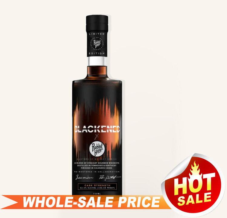 Blackened X Rabbit Hole Bourbon Whiskey is a remarkable collaboration between BLACKENED Whiskey's Master Distiller Rob Dietrich and Rabbit Hole Distillery’s Founder Kaveh Zamanian. This 2023 limited-edition release from the Masters of Whiskey Series blends the craftsmanship of two renowned whiskey makers. At its core is a 13-year-old straight Tennessee bourbon (64% corn, 36% rye) combined with Rabbit Hole’s Heigold High Rye Double Malt Kentucky Straight bourbon (70% corn, 25% malted rye, 5% malted barley). The blend undergoes an additional finishing touch in Calvados apple brandy casks, resulting in a cask-strength, non-chill filtered bourbon that delivers layers of complexity.