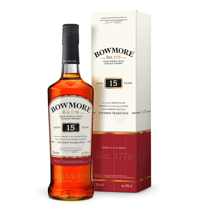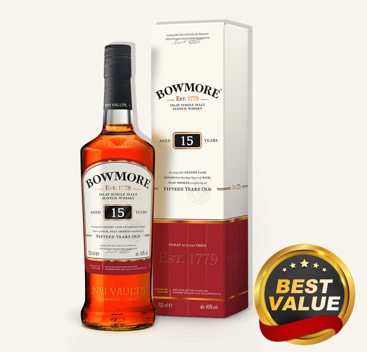 Matured first in bourbon barrels then Oloroso casks, there's no finer example of a sherry cask finish than our 15 Year Old. It's the final three years spent in Oloroso sherry casks that gives Bowmore 15 Year Old the rich, deep color and robust warming finish.