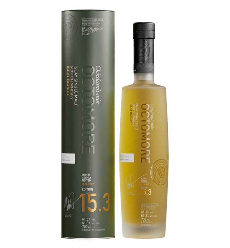 Bruichladdich Octomore Edition 15.3 Islay Single Malt Scotch Whisky is a powerhouse of flavor, blending intense peat smoke with the distinct character of barley grown at Octomore Farm, just two miles from the distillery. This edition is the second most heavily peated release in the Octomore series, offering a robust and complex experience. The Islay-grown barley imparts a cereal-forward sweetness, enhanced by casks that deliver notes of creamy vanilla and citrus fruits. The whisky’s golden syrup color hints at its rich, smoky profile, which is balanced by earthy undertones and a signature sea salt tang, creating a dynamic symphony of flavors.