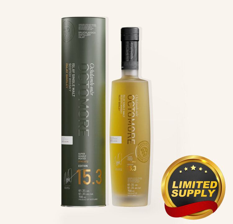 On the nose, Octomore 15.3 reveals smoked cinder toffee, malted barley sugar, and honey, with layers of fresh citrus, dried fruit, and seashells intermingling with its intense peat smoke. The palate, despite its high strength, is surprisingly smooth and viscous, offering flavors of butterscotch, creamy vanilla, and sweet orange zest, with toasted oak and barley sugar weaving through the dry smoke. The finish lingers with burnt sugar, coconut, and delicate sea spray, leaving behind the unmistakable presence of earthy peat smoke, enticing you to take another sip. Octomore 15.3 pairs best with robust dishes like smoked meats, chargrilled steak, or rich blue cheeses, complementing its intense peat smoke and complex flavors.