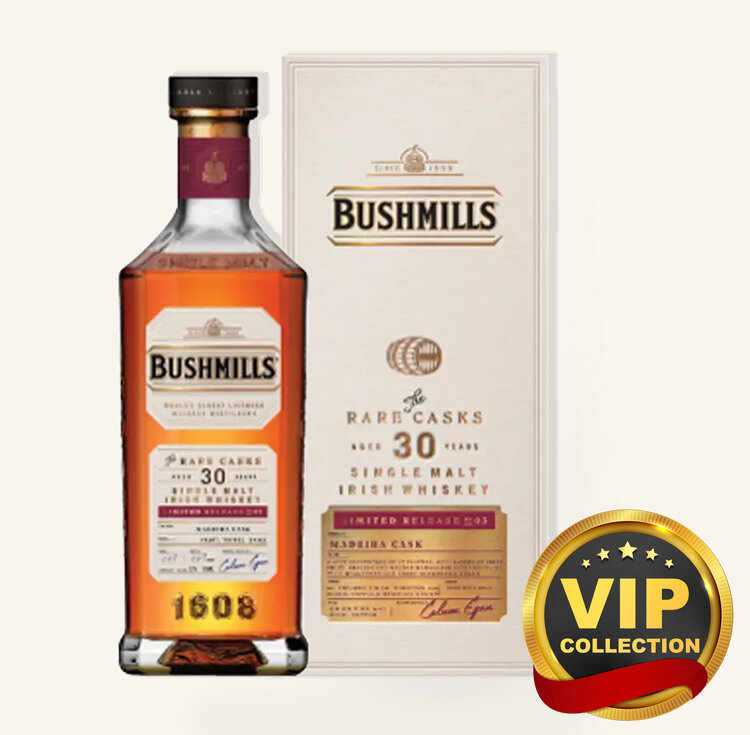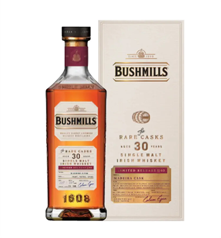 Presenting Limited Release No. 03 from Bushmills' "The Rare Casks" series - a collection of the world's most extraordinary single malt whiskeys. Aged in hand-selected casks and released in limited quantities across the US, this collection is a whiskey connoisseur's dream. The star of the series is the 30 Year Old Single Malt: Madeira Cask, the oldest entry thus far. The Madeira Cask adds a unique twist to the Rare Cask repertoire. The whiskey spends the majority of its maturation in three first-fill Madeira wine casks, following an initial aging period of just over 13 years in bourbon and sherry casks. The Madeira wine's character, influenced by the subtropical and rugged terroir, marks an exciting new flavor territory. Non-chill filtered and bottled at cask strength, the whiskey attains a balance and complexity of flavor that is unsurpassed. Lovers of Bushmills 21 Year Old's Madeira character, take note: This is the more complex and rare successor.