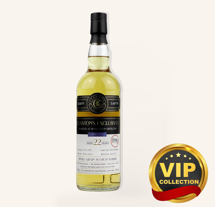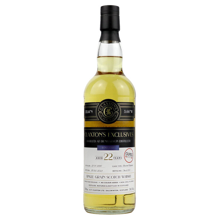Claxton’s Dumbarton 22 Yr Single Grain Scotch Whisky is a rare tribute from the now-closed Dumbarton Distillery, once the largest continuous grain whisky producer in Scotland, established in 1938 and shuttered in 2002. Independently bottled by Claxton’s, this expression was distilled on November 21, 2000, and spent nearly 22 years maturing in a single bourbon hogshead before being bottled at cask strength (58.5 % ABV) on June 19, 2023—just 202 bottles ever released. The whisky is non‑chill filtered, retains its natural color, and is presented as a single-cask masterpiece, reflecting Claxton’s meticulous selection process and commitment to preserving the soul of each barrel.