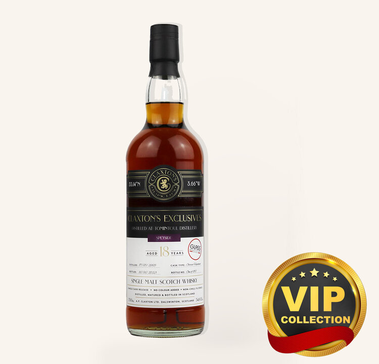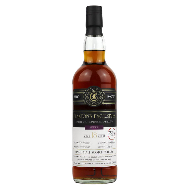 Nestled in the peaceful heights of Speyside’s Cairngorms, Tomintoul Distillery was founded in 1964 and continues crafting whisky from the famed Ballantruan spring—a source celebrated for its soft purity. Under the stewardship of fourth-generation Speyside master distiller Robert Fleming, Tomintoul has become renowned for its elegantly smooth and well-balanced single malts. Claxton’s Exclusive Tomintoul 18-Year is an independently bottled treasure, originally distilled on May 17, 2005, and matured for nearly two decades before being re-racked into an Oloroso sherry hogshead in 2020 and bottled in mid‑2023 at a robust 54.8% ABV. This limited-edition cask strength release—just 180 bottles—showcases the craftsmanship of both Tomintoul and Claxton’s discerning selection.