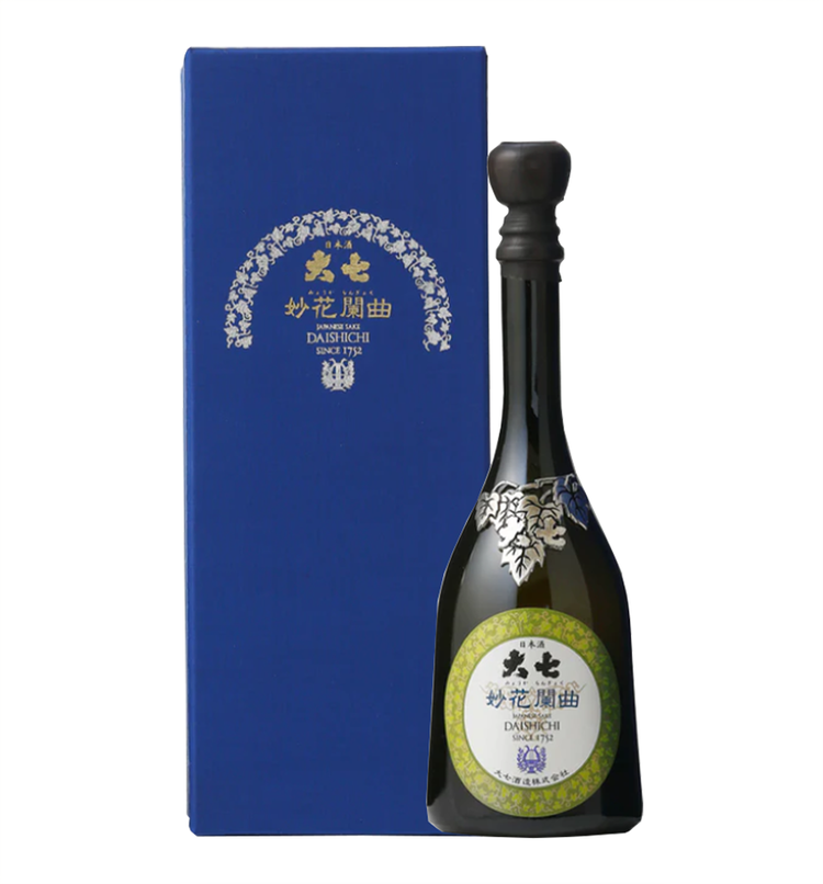 The yeast, which had survived the severe natural selection of the kimoto method, drove a powerful fermentation in the ginjo mash, which was kept for a long time at a low temperature. On the day of the pressing, Daishichi found a wonderfully transparent, large, and tight “bud.” They foresaw that this new-born sake could go much further and reach a higher peak than ever before. This is the story of the birth of this ultimate sake, “Myoka Rangyoku.” They promise that Daishichi will only adorn sake that has reached the same high level as the crown of this appellation.