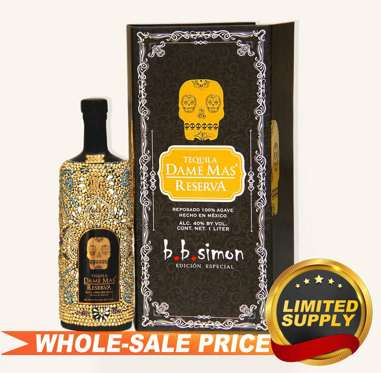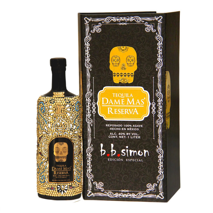 Introducing the limited edition Tequila Dame Mas x BB Simon collaboration bottle, a stunning combination of luxury tequila and high-end fashion. The bottle features a sleek and modern design with a signature BB Simon crystal-studded label, adding a touch of glamour to any home bar. Inside, you'll find the finest 100% blue agave tequila, carefully crafted using traditional methods to ensure the best flavor and quality.