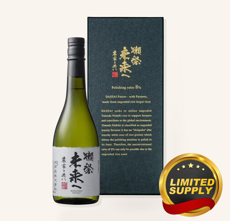 Dassai Future With Farmers is a truly pioneering sake born from a spirit of sustainability and innovation at Asahi Shuzō in Yamaguchi Prefecture. Rather than discarding imperfect Togai Yamada-Nishiki rice—rice rejected for its irregular shape or lack of a well-defined starchy core—the brewery embarked on a daring challenge: polishing it down to just 8% of its original grain size, a rate even more extreme than their flagship 23-percent polishing ratio. This process, spearheaded by Shoji Ide, was so delicate that it required combining rice from multiple polishing machines into one and took roughly 10 days—about 2.5 times longer than usual. The result is a sake that not only uplifts underutilized rice and supports farmers, but also embodies Dassai’s dedication to craftsmanship: a rare Junmai Daiginjo of remarkable clarity, complexity, and meaning.