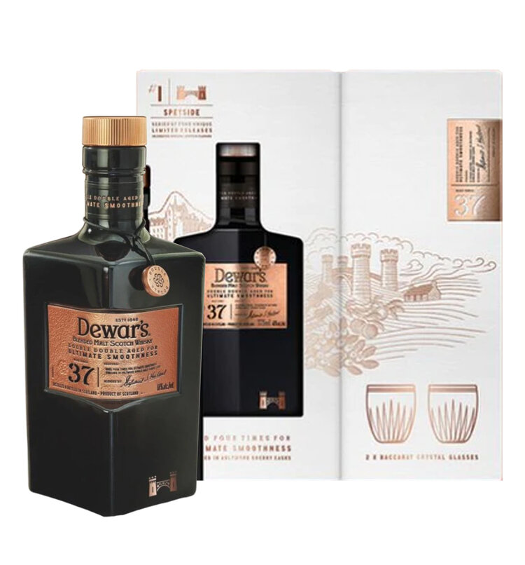EACH BOTTLE INCLUDES ONE 375mL BOTTLE OF DEWAR’S 37 WITH 2 BACCARAT CRYSTAL GLASSES