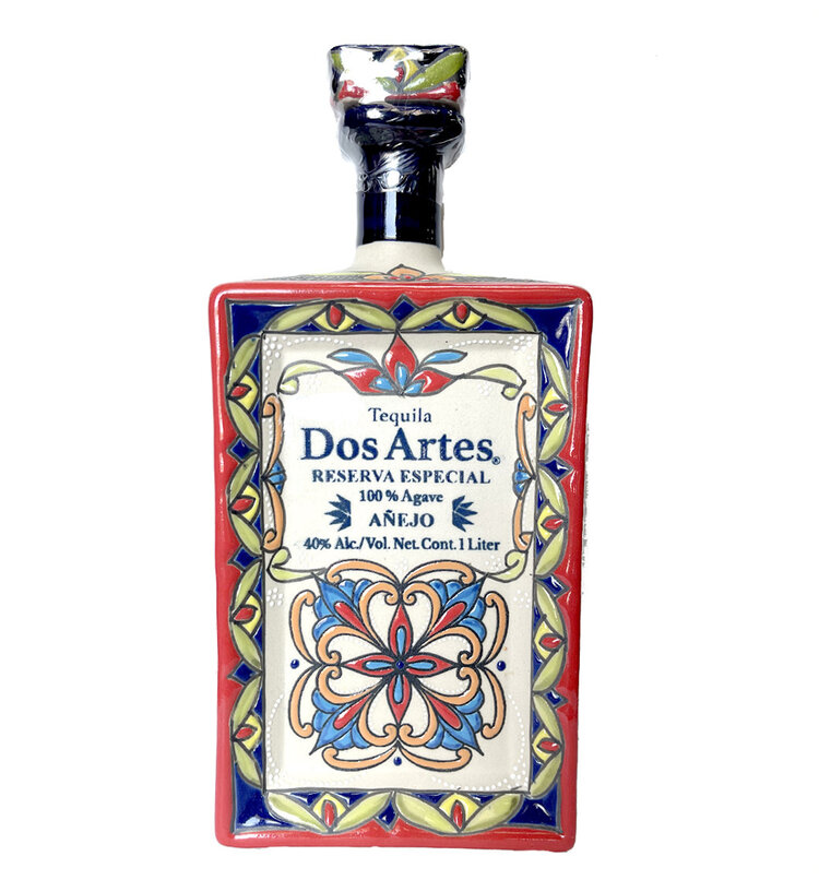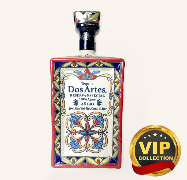 Dos Artes Añejo Reserva Especial Tequila is an exceptional expression of craftsmanship, made from 100% estate-grown blue agave. Aged for 18 months, this tequila undergoes double distillation for enhanced purity and a natural fermentation process that incorporates the gentle influence of classical music, believed to enrich its complexity. Each bottle is a work of art, housed in a hand-painted ceramic vessel, making every bottle unique and part of the tequila's rich story. The tequila is aged for 15 months in American oak barrels and finished for 3 months in virgin French oak, adding depth to its profile.