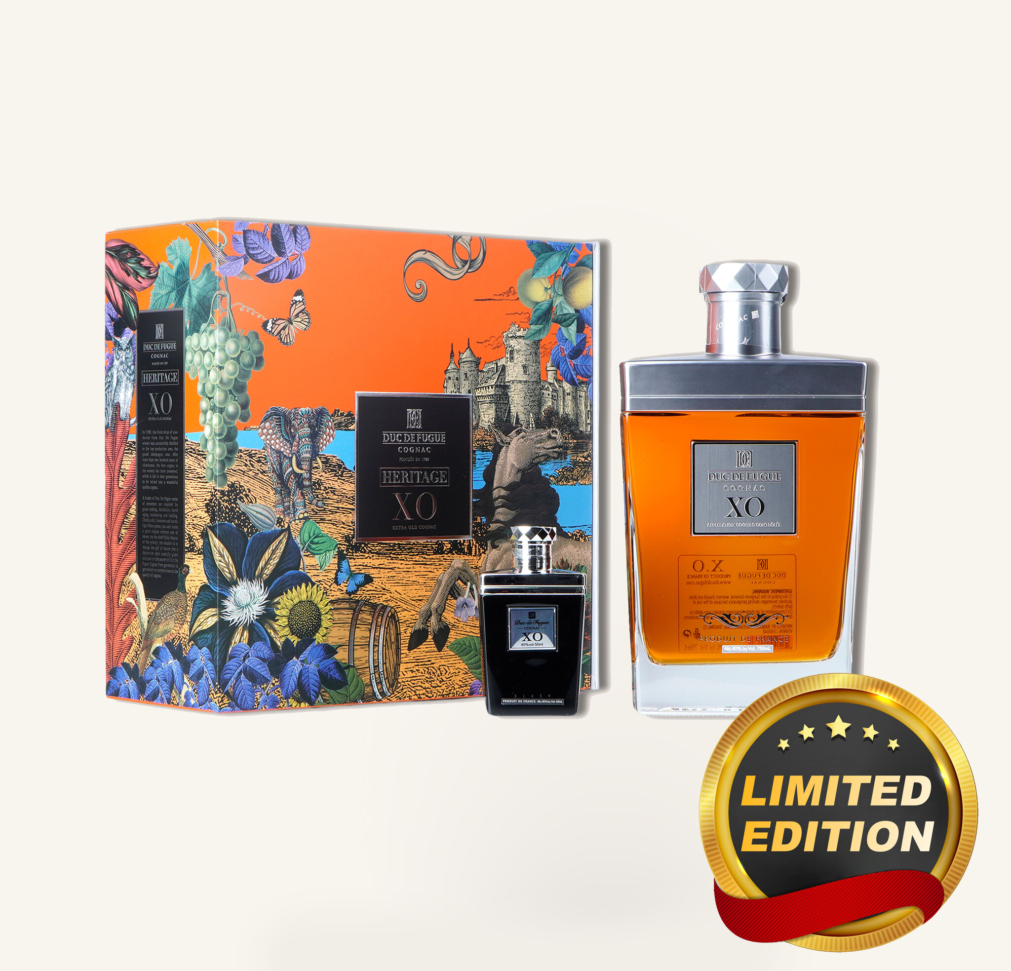 Duc de Fugue XO Heritage Cognac Gift Set is a distinguished French creation that reflects the brand’s dedication to refinement, tradition, and elegant presentation. This special set pairs the classic XO Heritage expression with a miniature bottle of Duc de Fugue XO Black, offering a beautifully curated experience for collectors and enthusiasts. Carefully matured and thoughtfully blended, the main expression showcases the depth and harmony that develop through extended aging. Presented in an elegant gift package, this set highlights both craftsmanship and sophistication, making it an impressive choice for special occasions or as a refined addition to a premium collection.