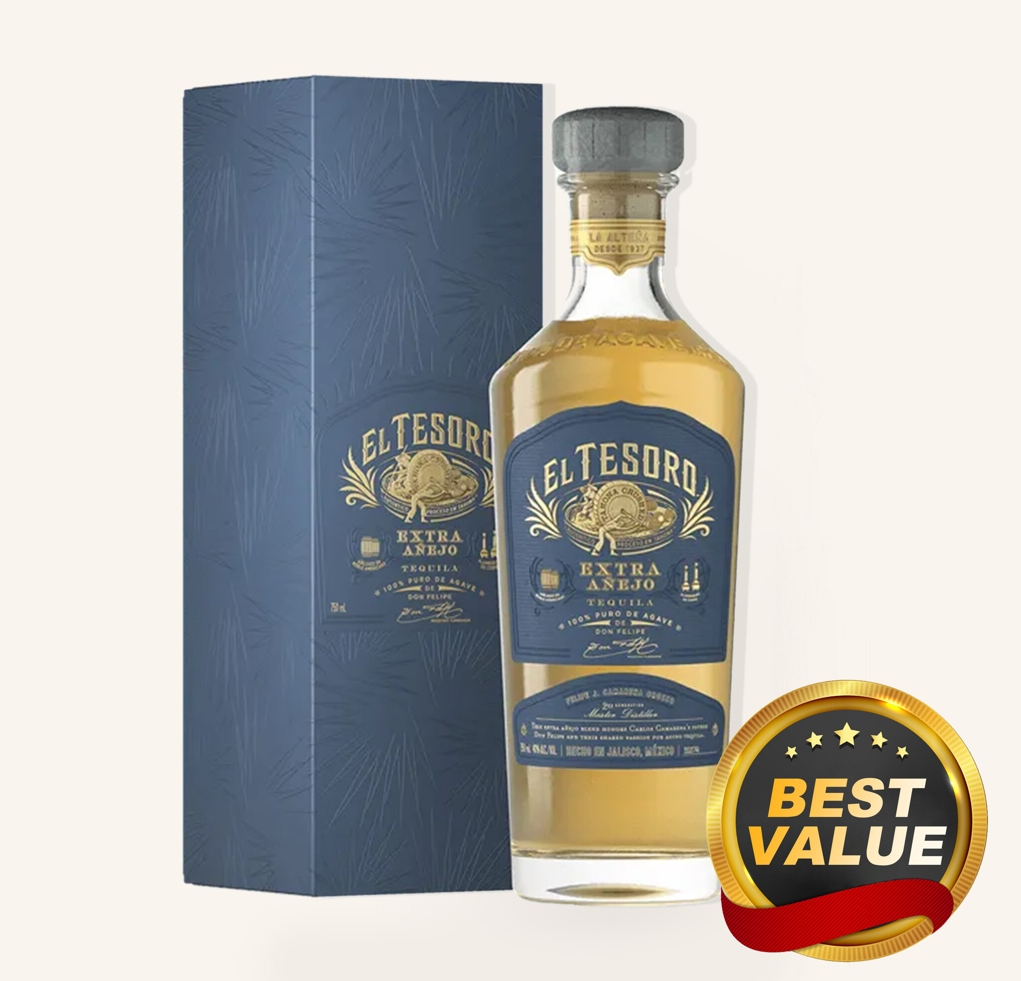 El Tesoro Extra Añejo Tequila is a distinguished, long-aged expression from El Tesoro Tequila, honoring the legacy of Felipe J. Camarena and the Camarena family’s deep-rooted passion for traditional craftsmanship. Guided by Master Distiller Carlos Camarena, this exceptional release is matured patiently for four to five years in American oak barrels that previously held bourbon. The extended aging develops remarkable depth and complexity, resulting in a vibrant golden hue and a luxuriously layered profile. Carefully blended to achieve harmony and richness, El Tesoro Extra Añejo represents the pinnacle of the brand’s dedication to heritage, patience, and uncompromising quality.