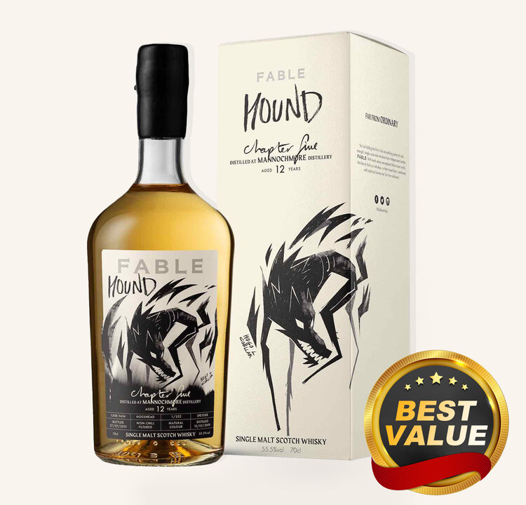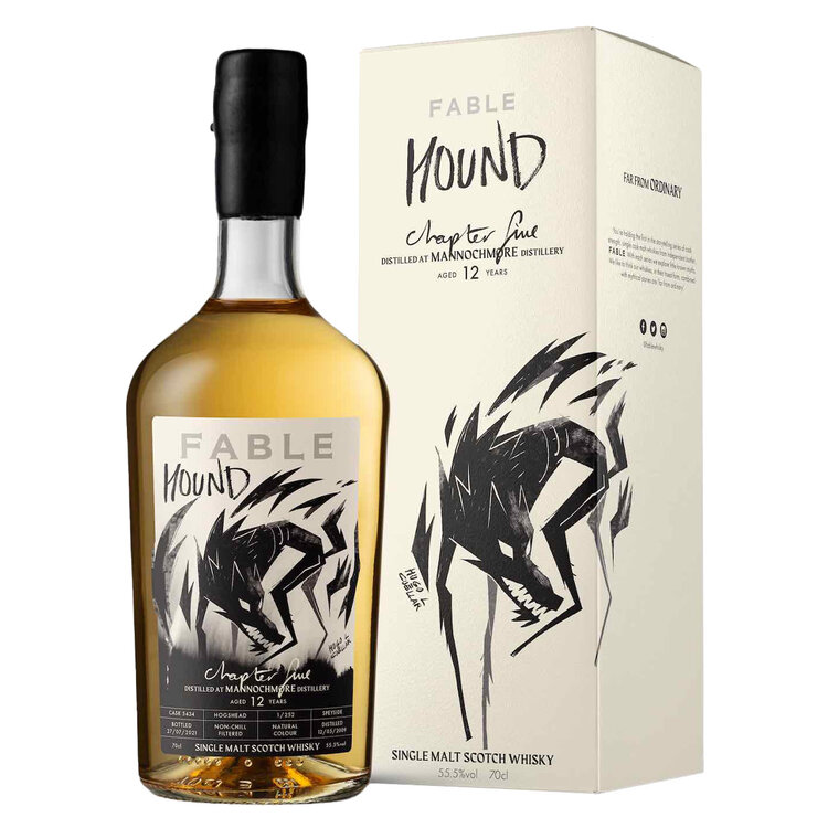 Part of Fable Whisky’s inaugural series “The Ghost Piper of Clanyard Bay”, Chapter 5: Hound showcases a single‑cask, 12‑year‐old release from Mannochmore Distillery in Speyside, independently bottled at cask strength (55.5% ABV). Fable, an artisan bottler, merges high‑quality spirits with folktale artistry—this dram represents the loyal hound from the coastal legend, captured in the dramatic label art and storytelling packaging. The spirit matured for exactly 12 years in a single ex‑Bourbon hogshead (cask #5434), allowing the rich Speyside character of Mannochmore—known for its fruit-forward, lightly creamy profile—to develop naturally, without chill filtration or added coloring.