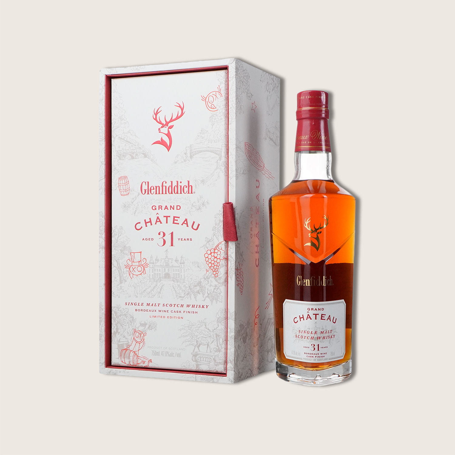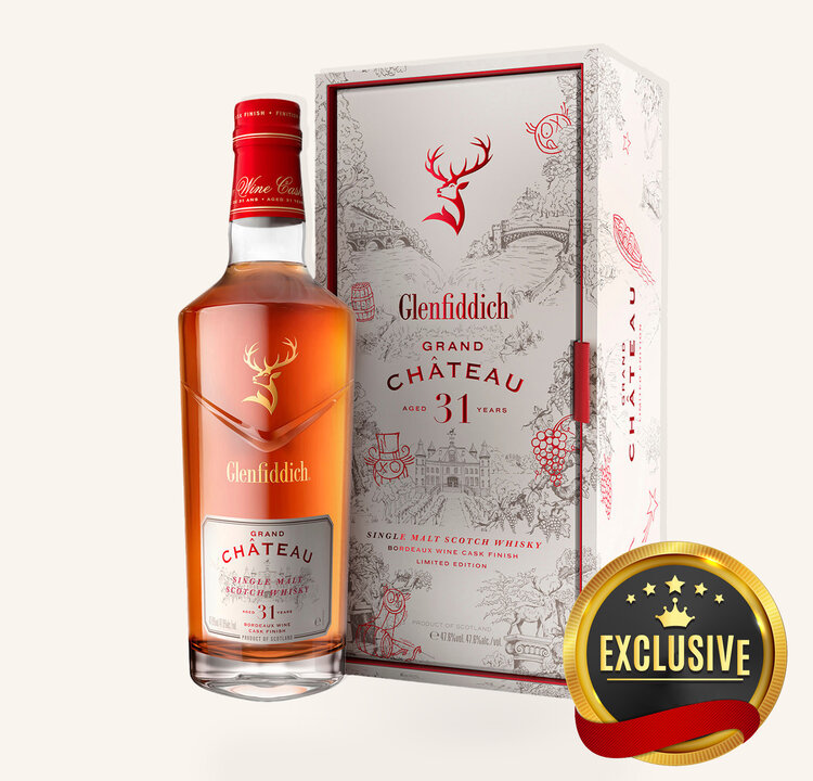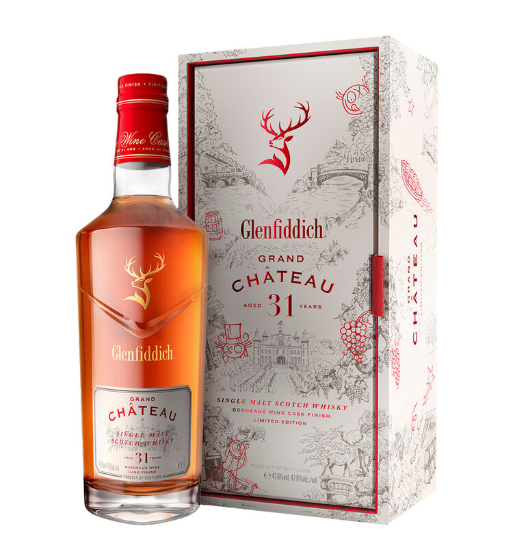 Glenfiddich's Grand Château is an exceptional 31-year-old Single Malt Scotch Whisky that exemplifies the distillery's innovative spirit and dedication to craftsmanship. This limited edition release is notably the first from Glenfiddich to undergo an extended nine-year finishing period in Bordeaux red wine casks, following its initial maturation in American oak. This unique cask combination enriches the whisky with remarkable depth and complexity, offering an unexpected fusion of Speyside and French wine heritage. The collaboration with internationally acclaimed French graffiti artist André Saraiva adds an artistic dimension to this release, with his signature 'Mr. A' character playfully adorning the packaging, reflecting the harmonious blend of traditional whisky-making and contemporary art.