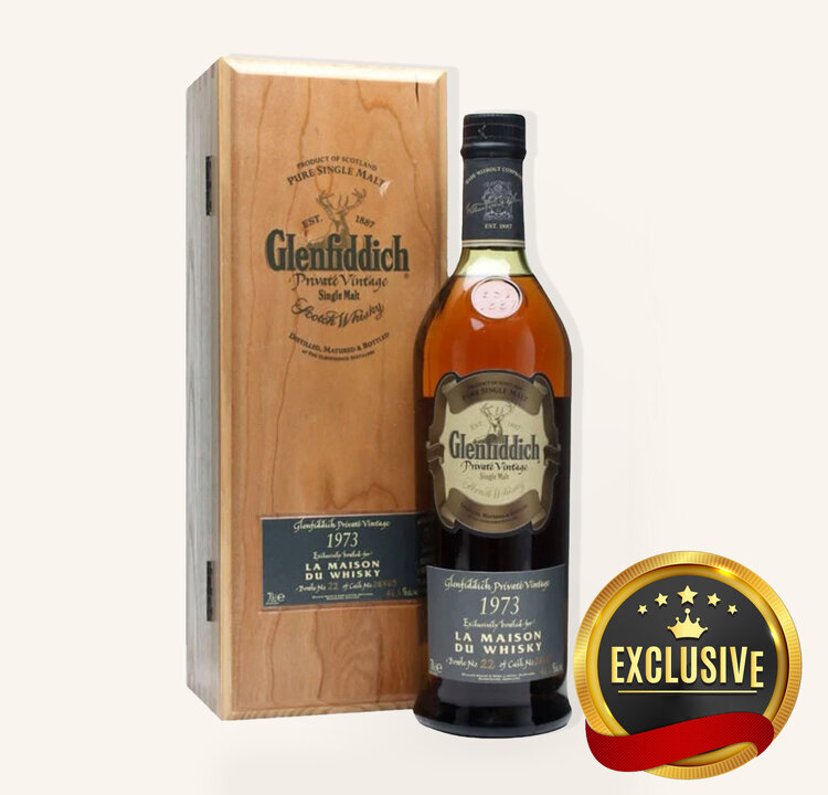 The Glenfiddich 1973 Private Vintage 34-Year-Old is an exceptionally rare single malt Scotch whisky that epitomizes the distillery's dedication to craftsmanship and tradition. Distilled in 1973 at the Glenfiddich Distillery in Dufftown, Scotland—a family-owned establishment since 1886—it matured for 34 years in a single American oak hogshead cask (No. 28563) before being bottled in 2007. This limited release, comprising only 209 bottles, was specially produced for La Maison du Whisky in France and is presented in an elegant cherry wood box, reflecting the brand's commitment to excellence.