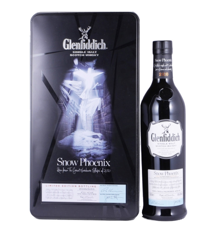 The Glenfiddich Snow Phoenix Speyside single malt scotch whisky was matured in selected Spanish oloroso sherry and American bourbon casks and was bottled in the year 2010 on the occasion of a dramatic event in the distillery s history in a limited edition without chill filtration. The Snow Phoenix single malt is intended as a reminder of the winter of 2009/2010, when so much snow fell within a short period of time that on the evening of 7th January 2010, parts of the roofs of four warehouses collapsed under the heavy weight of the snow. Malt Master Brian Kinsman and the distillery team recovered the casks of varying ages from the affected warehouses at temperatures as low as -19° C and skilfully married the best of the Oloroso and American oak casks affected by the roof collapse to create the Glenfiddich Snow Phoenix single malt.