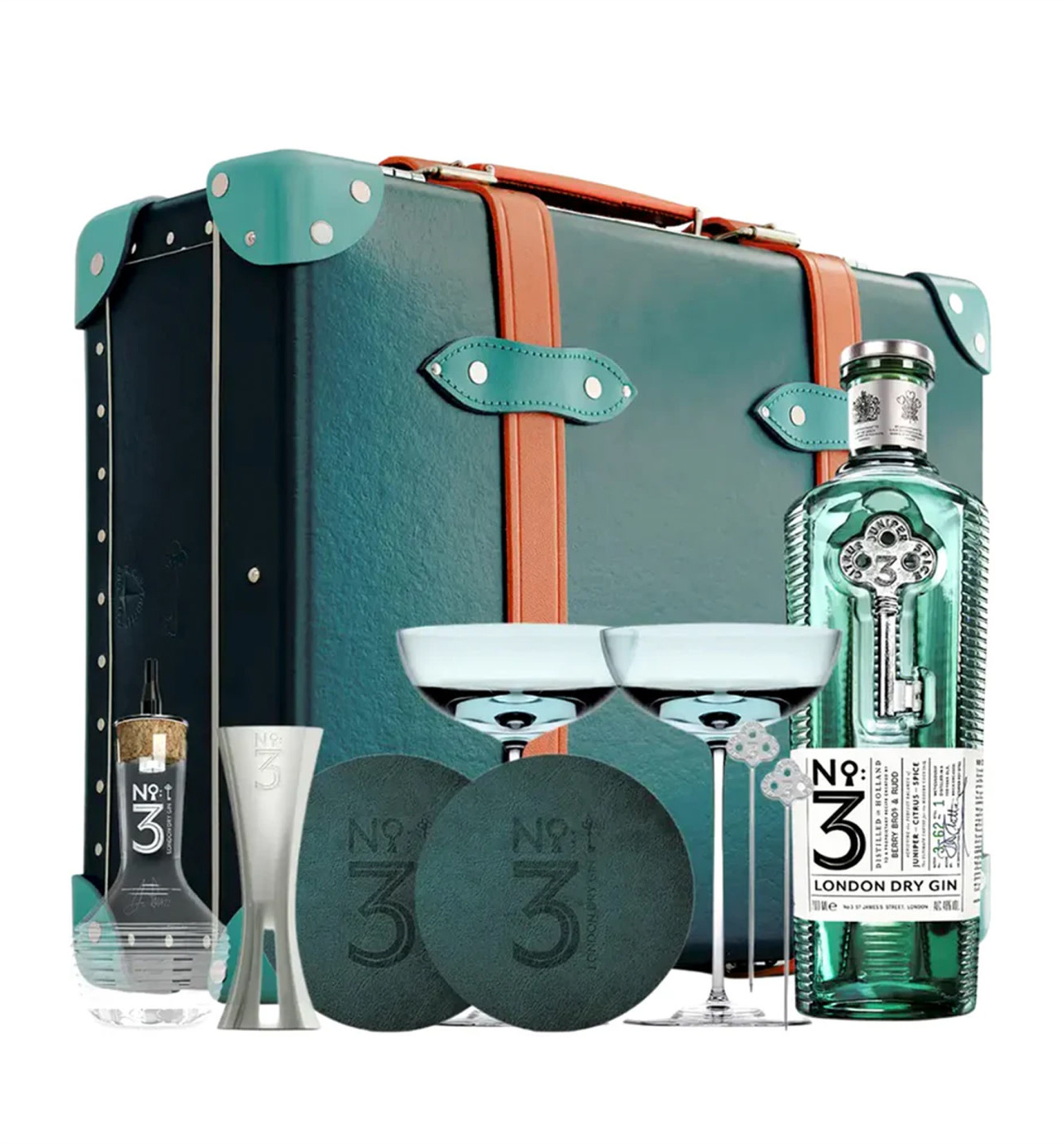 Accessories: Two leather embossed coasters, two branded Martini picks, and a No.3 branded jigger.