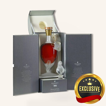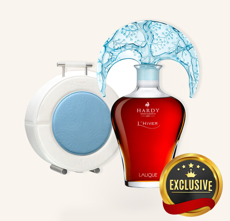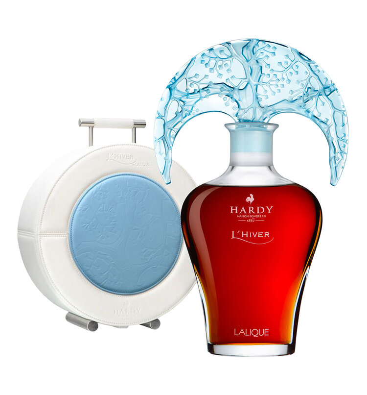 The Hardy Cognac L'Hiver by Lalique** is the exquisite finale of the Four Seasons Collection, symbolizing the peaceful dormancy of winter with its stunning ice-blue decanter. This masterpiece contains a rare blend of century-old cognacs, crafted from Ugni Blanc, Folle Blanche, and Colombard grapes, with eaux-de-vie sourced from the prestigious Grande Champagne region. Selected by Armand Hardy, the eaux-de-vie were carefully collected between the two World Wars, renowned for their exceptional finesse and housed in the rarest reserves of Hardy's Paradis cellar.