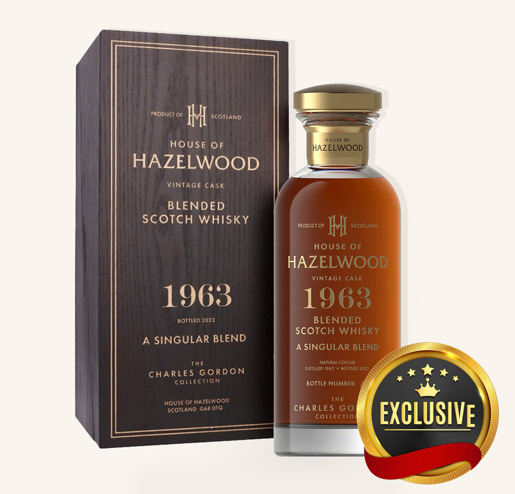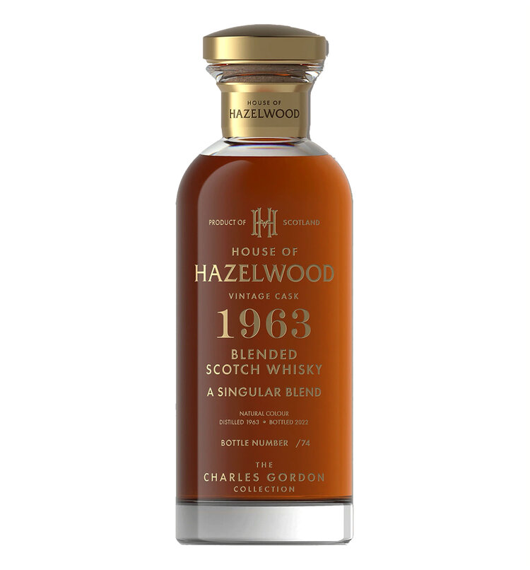 House of Hazelwood's "A Singular Blend 1963 Vintage" is an extraordinary and rare Scotch whisky, capturing the essence of a bygone era. What makes this release unique is its composition, featuring both grain and malt whiskies distilled at the same Highland distillery in 1963, an unusual practice in modern whisky production. Aged for 58 years in American oak, this whisky has developed intricate layers of complexity, reflecting the character of the distillery. Packaged in a hand-engraved, individually numbered decanter with an ash display box, adorned with gold leaf inlay, it stands as a testament to luxury and craftsmanship.