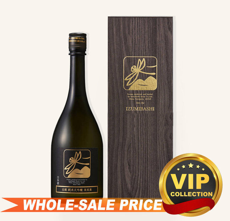 Izumibashi Brewing Company's dragonfly emblem represents their commitment to reduce pesticides when cultivating sake rice. Crafted using the traditional kimoto method in small batches, their junmai is made from the rare Rakufumai sake rice grown exclusively on their farm. This newer variety is harvested early, polished in-house, and brewed using a traditional "fune" press rarely employed today. Only the finest "nakadori" sake, from the middle of the yield, is utilized, ensuring a distinctive and flavorful product.