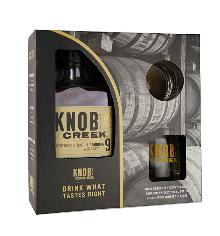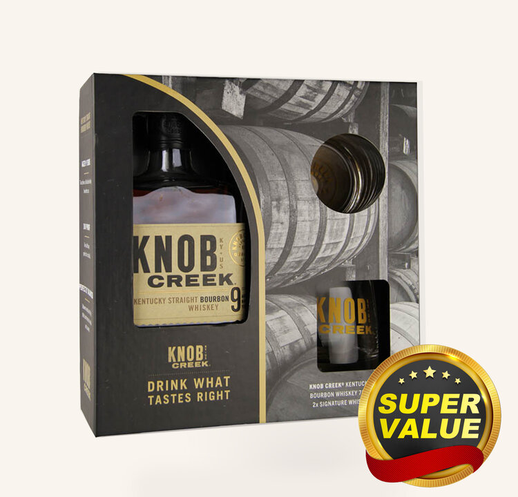 The Knob Creek Kentucky Straight Bourbon 100 Proof with 2 Rock Glasses (750ml) is a compelling offering for bourbon enthusiasts, combining a bottle of Knob Creek’s signature small batch bourbon with two elegant rock glasses. This gift set reflects the brand's dedication to pre-Prohibition-style bourbon-making, with craftsmanship rooted in tradition and bold flavor. Produced at the historic Jim Beam Distillery in Clermont, Kentucky, Knob Creek Bourbon is aged for nine years in deeply charred American oak barrels and bottled at 100 proof, resulting in a rich, full-bodied spirit. The inclusion of the custom glassware makes this set perfect for immediate enjoyment or thoughtful gifting.