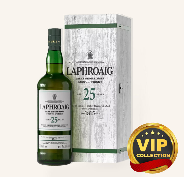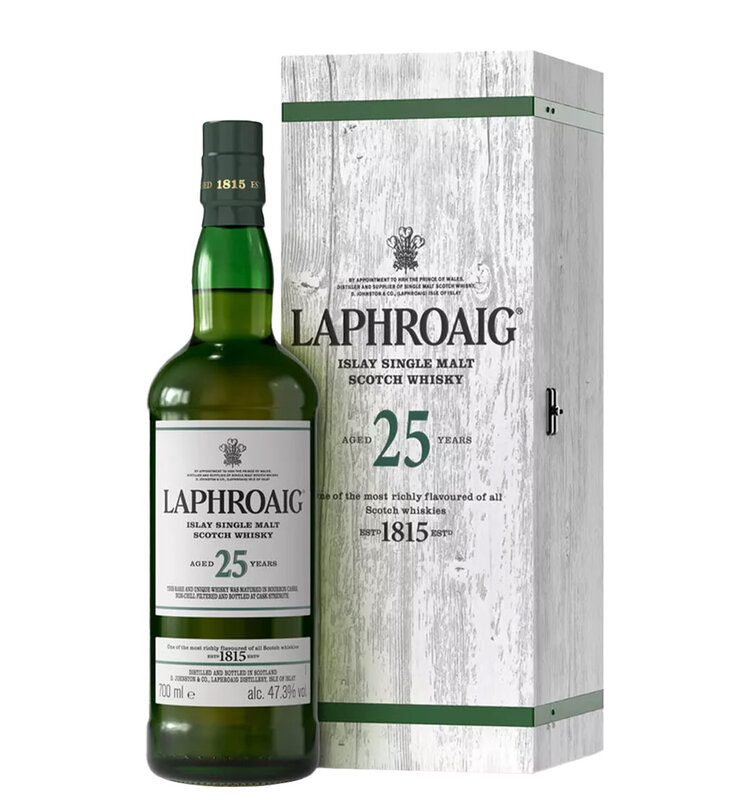 Laphroaig 25 Year Old Cask Strength hails from the Isle of Islay, Scotland. This whisky is known for its bold and intense flavors, characteristic of Islay's peated whiskies. It has a complex palate featuring a harmonious blend of smoky peat, rich oak, and sweet vanilla, with hints of dried fruit and spices.