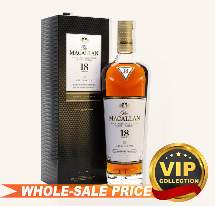 Outstanding, complex Single Malt, matured at The Macallan distillery for a minimum of 18 years in selected Sherry oak casks from Spain. Rich palate of dried fruits, spice, orange and wood smoke. Full-bodied, lingering, smooth, elegant and aromatic finish.