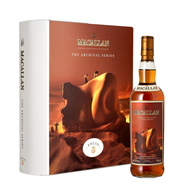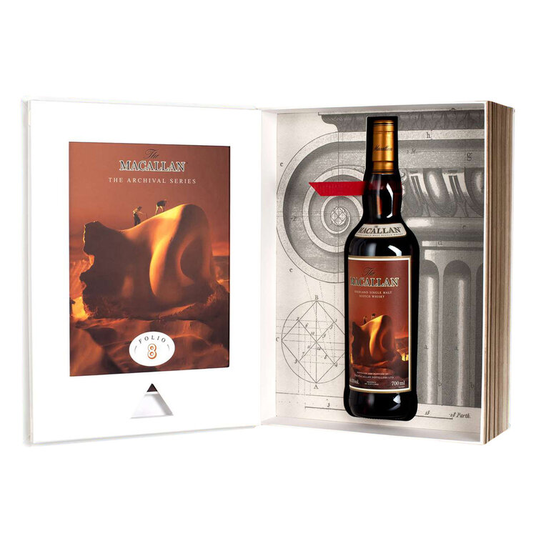 The Macallan Archival Series Folio 8 is a distinguished single malt Scotch whisky that pays homage to the brand's iconic advertising campaigns of the 1980s and 1990s. This limited edition commemorates the "Colossus of Nose" advertisement, which playfully highlighted the whisky's rich aromatic profile. Crafted from a selection of first-fill and refill European oak sherry casks, Folio 8 embodies The Macallan's signature sherry-forward character. Bottled at 43% ABV, it presents a vintage terracotta hue, reflecting its depth and complexity.