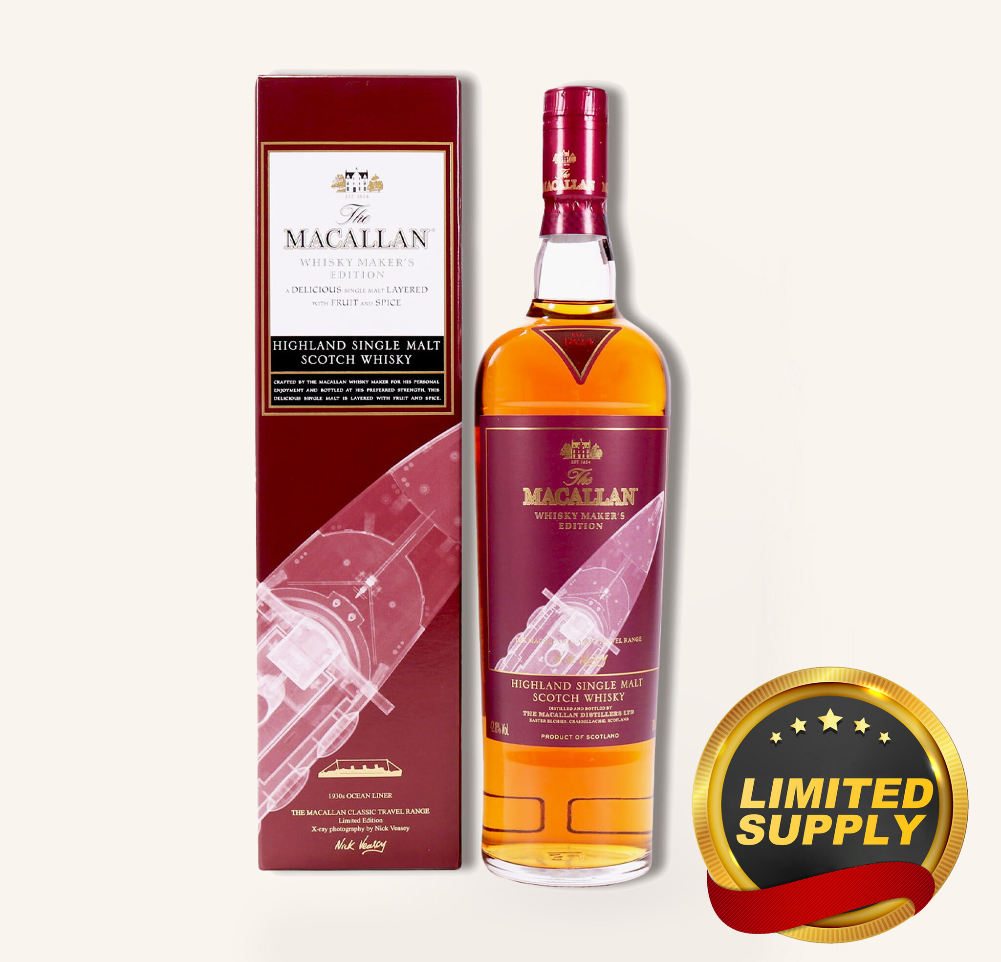 Macallan Maker’s Edition Classic Travel Range 1930s Ocean Liner is a refined collector release that celebrates the brand’s enduring heritage and creative vision. Part of the Classic Travel Range, this edition reimagines the original Travel Series first introduced in the early 2000s, bringing a modern perspective to a beloved concept. It also marks Macallan’s second collaboration with acclaimed X-ray photographer Nick Veasey, whose distinctive artwork reveals the inner structure of iconic objects—in this case, a 1930s ocean liner—symbolizing craftsmanship, engineering, and timeless elegance. Designed for global explorers and connoisseurs alike, this release reflects Macallan’s commitment to quality, storytelling, and thoughtful presentation.