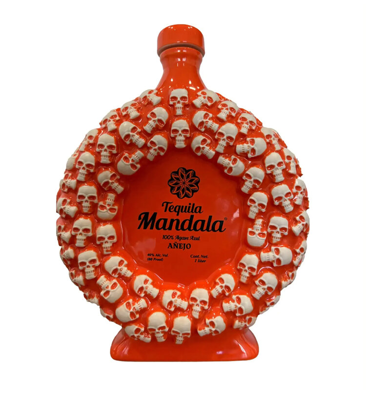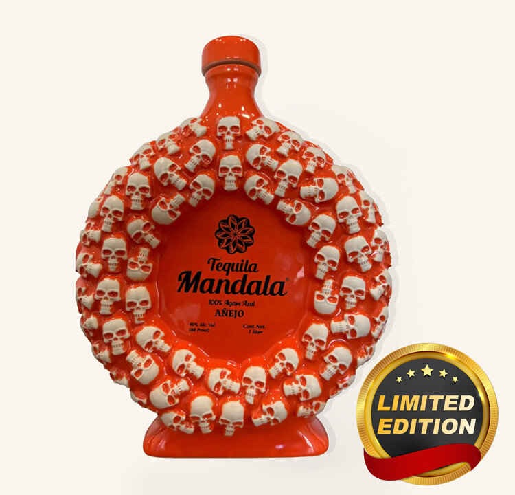 Tequila Mandala Añejo Dia De Los Muertos 2024 Edition is a bold homage to Mexico's rich cultural heritage, specifically the iconic Day of the Dead celebration. Encased in a vibrant orange ceramic bottle, this limited edition tequila is a visual masterpiece, adorned with hand-painted white skulls. These intricate skull designs, arranged in a mesmerizing mandala pattern, symbolize the deep connection between life and death, honoring the spirits of departed loved ones while celebrating the cyclical nature of existence.