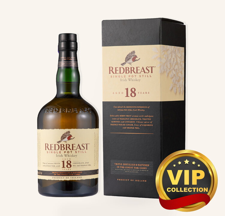 Redbreast 18 Year Old Single Pot Still Irish Whiskey is a pinnacle expression of Ireland's rich whiskey-making heritage. Crafted at the Midleton Distillery in County Cork, this whiskey embodies over a century of tradition, utilizing a mash bill of malted and unmalted barley and triple distillation in copper pot stills. Matured for 18 years in a combination of American oak bourbon barrels and Spanish oak Oloroso sherry butts, it showcases the meticulous craftsmanship and dedication to quality that Redbreast is renowned for. This expression has garnered numerous accolades, including Gold medals at the 2024 Spirits Business Irish Whiskey Masters and the International Wine & Spirit Competition.