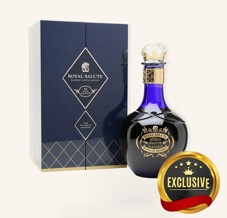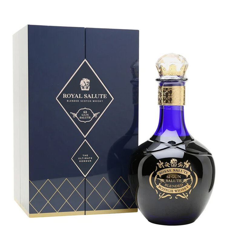 The Royal Salute 62 Gun Salute is the pinnacle of Royal Salute's blending expertise. It brings together specially selected whiskies from casks personally reserved over the years by each of Royal Salute's Master Blenders. 62 Gun Salute is housed in a midnight blue Dartington Crystal decanter that is carefully shaped, cut, and decorated by hand by highly skilled master craftsmen. Adorned in 24-cararat gold and crowned with a cut crystal stopper, each decanter is the result of 30 hours of care and attention and is a true work of art.