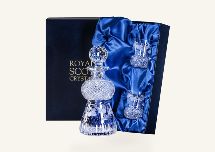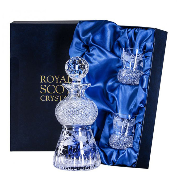A unique and beautifully hand made and cut Flower of Scotland Round Thistle Shaped Spirit Decanter and pair of tumblers.