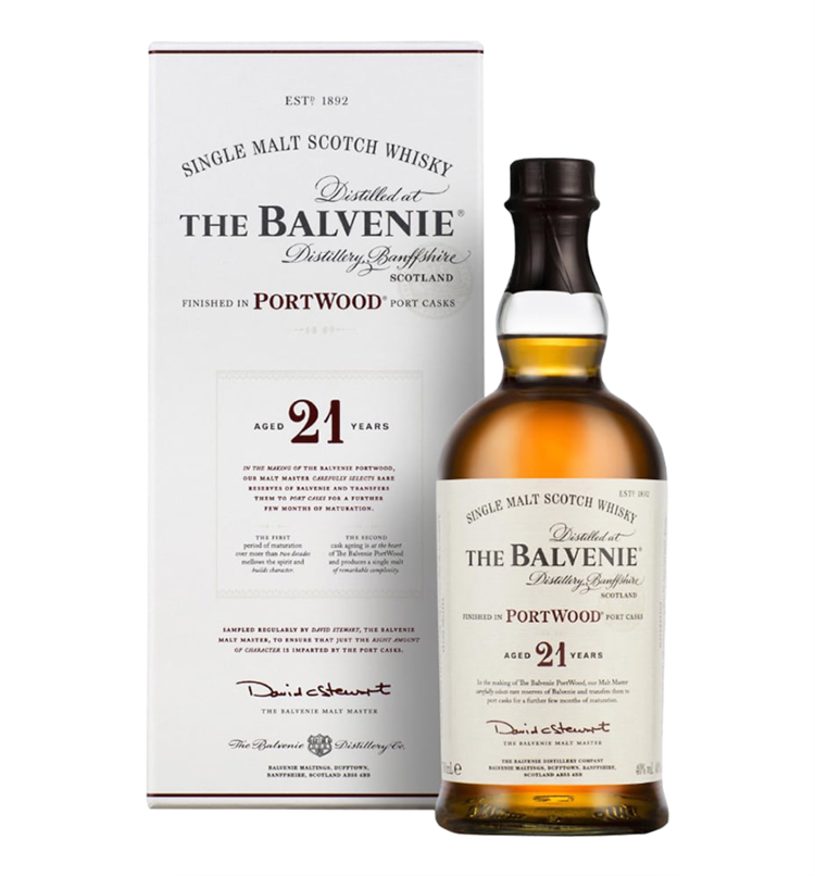 To create The Balvenie PortWood 21 year old single malt whisky, a marriage of rare Balvenie is transferred to port casks, or pipes, which have held fine port wines.