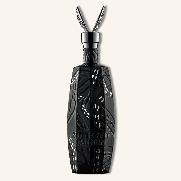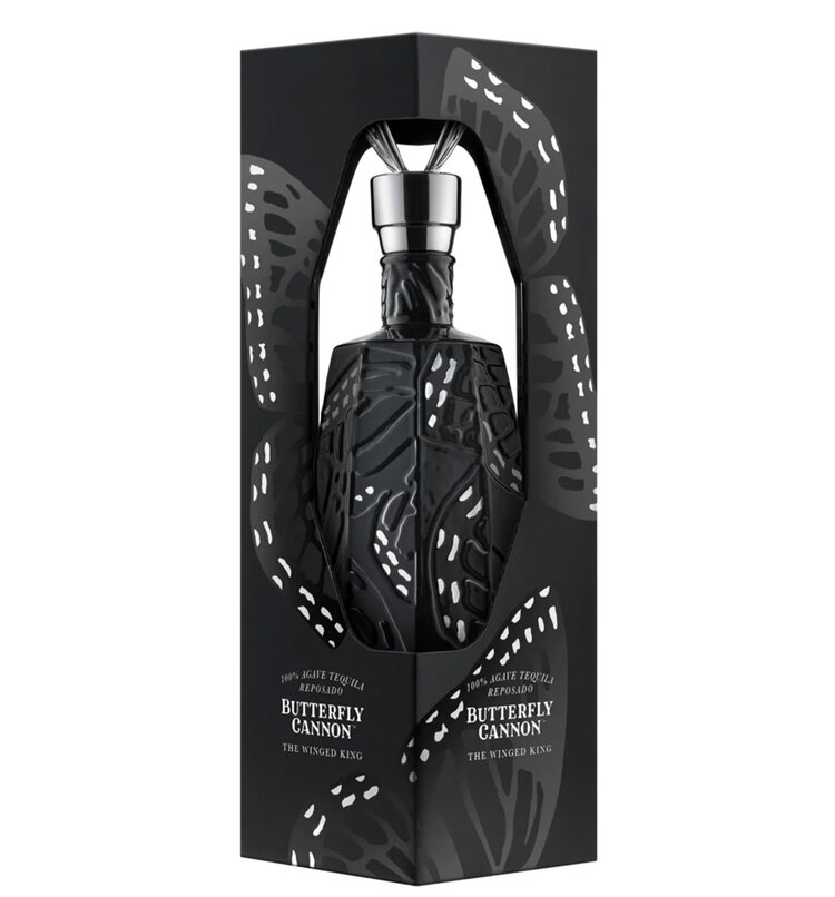 The Butterfly Cannon "The Winged King" Tequila is crafted from 7–8 year-old hand-harvested agave, which is slow-cooked in traditional steam ovens to preserve its natural flavor. After cooking for at least three days and cooling for an additional 2-3 days, the agave is mashed and distilled. The tequila is aged in American oak barrels, resulting in a rich amber liquid that is then decanted into a distinctive heavyweight ceramic bottle.
