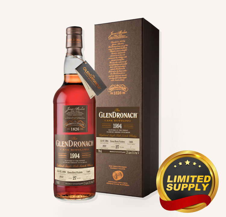Each year, only a small number of casks are carefully selected from the historic stone warehouses of The Glendronach, ensuring that only the most exceptional examples are released. Cask #7466, filled in 1994 and matured for 27 years in an Oloroso puncheon, embodies the house’s dedication to patience and depth. Over nearly three decades, this large cask has nurtured the spirit into a profound expression layered with richness, complexity, and refined character. Bottled by hand, unfiltered, and naturally colored, it stands as a testament to traditional craftsmanship and is highly sought after by collectors who value both rarity and authenticity.