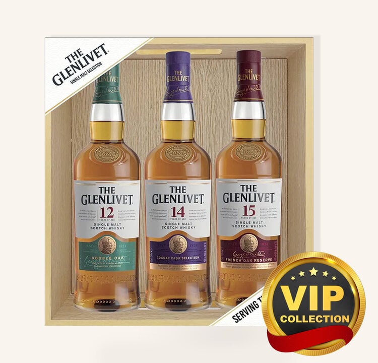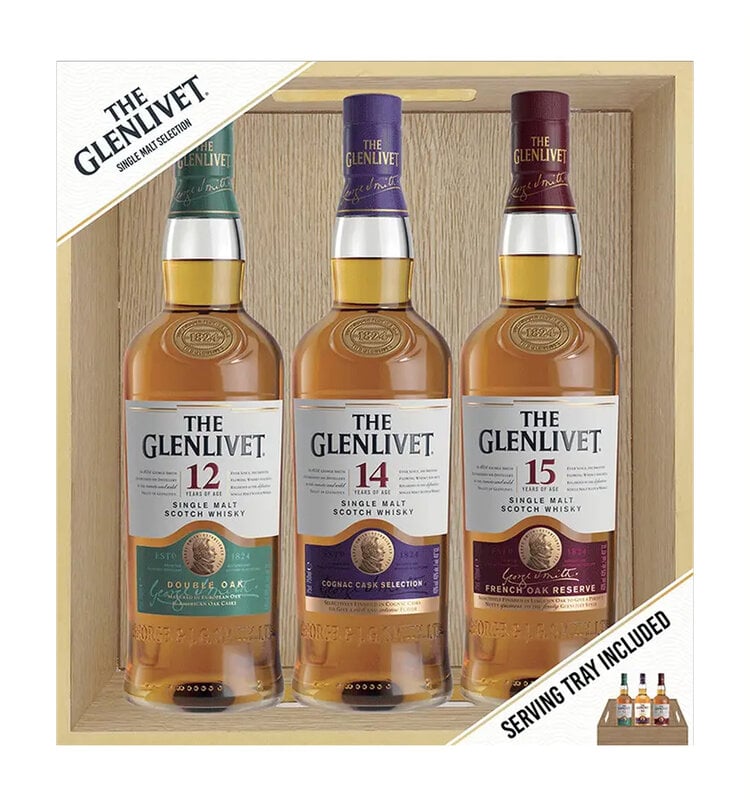 Scotland- The perfect holiday gift for Scotch lovers including 3 750ml bottles of Glenlivet - the iconic Glenlivet 12 Yr, Glenlivet 14 Yr aged in Cognac casks and Glenlivet 15 Yr aged in French Oak casks. Presented in a high-quality wood box, that can be used as a cocktail serving tray.