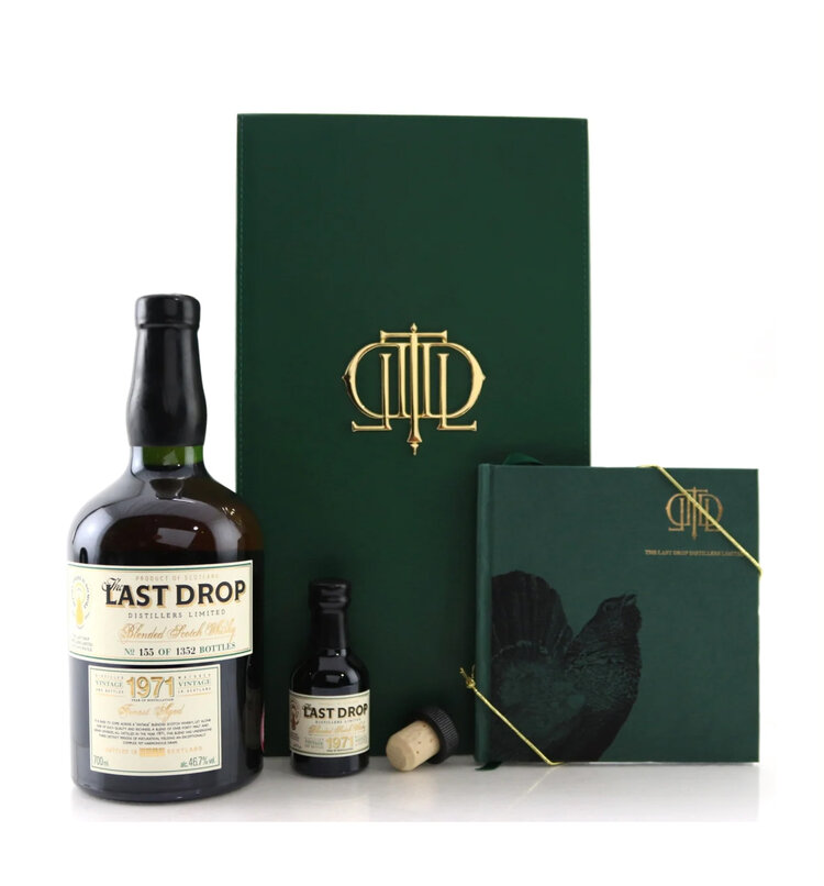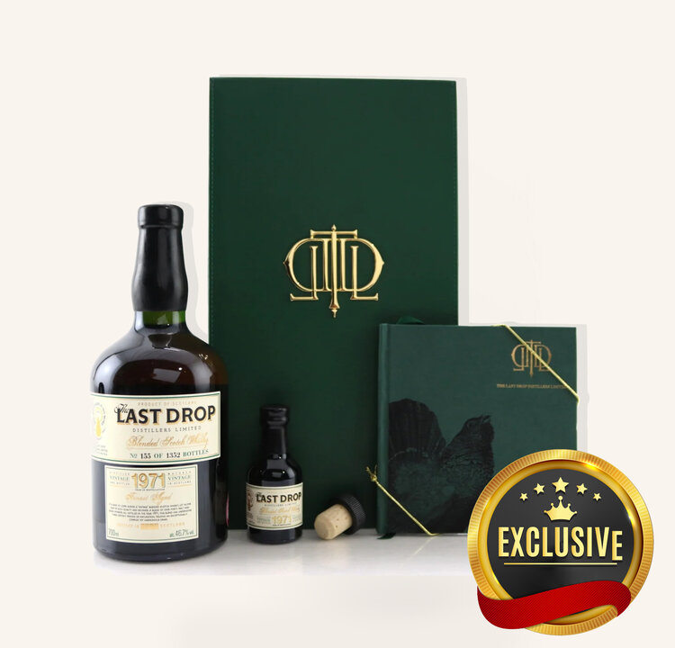 The Last Drop 1971 Blended Scotch Whisky - The Last Drop 1971 Blended Scotch Whisky is the newest release from the ultra rare Last Drop collection. It began its life in 1983 and was originally blended into 11 sherry butts where it was left to marry for 9 more years. At 21 Years part of the blend was bottled and the rest was transferred to for a third maturation. The rest of its 24 years were spent in American oak. The resulting whiskey is one of the most complex and powerful blends we've yet to come across. Ultra decadent and complex, but not sappy or overly sweet. Expect a nose of pungent wild honey, roasting nuts, fresh spices and bright citrus. The palate is dominated by stewed fruits pointed with citrus rind and bold vanilla. Subtle phenol pops through as the long pleasing finish last indefinitely.