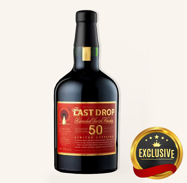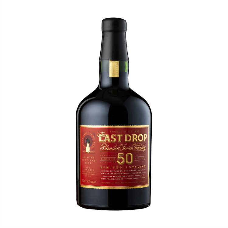 This is a blend. Not just any blend. More than 82 whiskies went into the original marrying vat, 50 years ago, many from distilleries long ago closed and forgotten. For 12 years the blend matured, and then most was bottled and sold as a fine 12-year old whisky. However, the company forgot just three casks; they lay at the back of the warehouse, unnoticed, evaporating (the "angels' share"), and developing an unequalled richness of nose and taste. It is from the very last of these barrels that The Last Drop 50 year old comes.