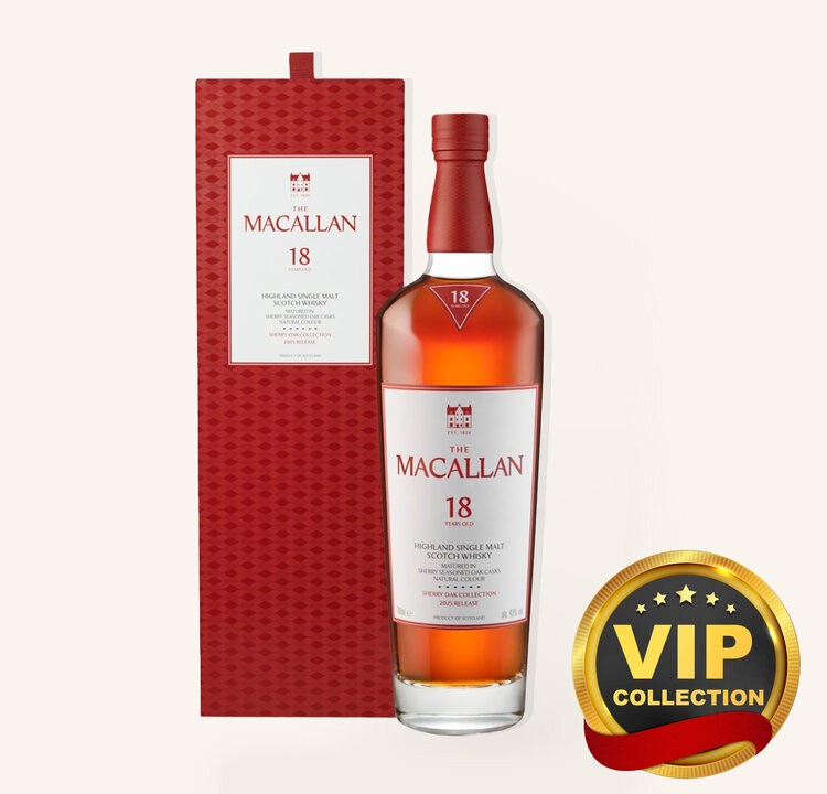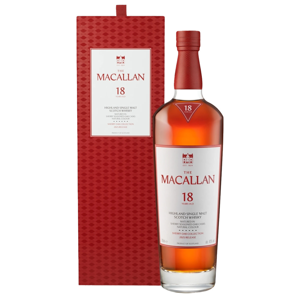 The Macallan Sherry Oak 18 Years Old forms part of Macallan's Sherry Oak Collection which features a series of single malt whiskies matured in hand-picked sherry-seasoned oak casks from Jerez for richness and complexity. The porous nature of Spanish sherry seasoned oak casks allows it to absorb a significant amount of that sherry flavor, which is then imparted to the whisky over time delivering greater complexity to the Scotch. This Whisky offers a full-bodied palate of mature oak, ginger and raisin flavours is complimented by a light mahogany natural colour.