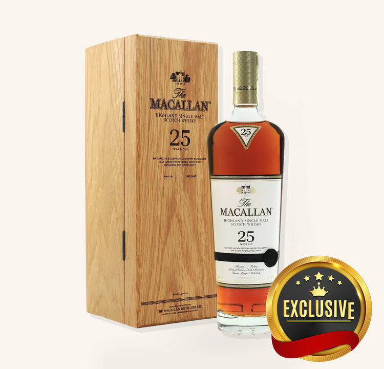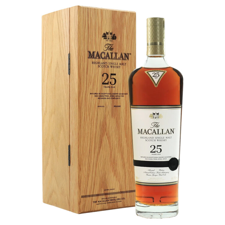 The Macallan Sherry Oak 25 Years Old 2024 Release is a pinnacle expression within the distillery’s iconic Sherry Oak Collection—a series of single malts matured exclusively in hand-picked, sherry-seasoned oak casks from Jerez, Spain. Nurtured for a quarter century in European oak, each cask is carefully sourced, crafted, toasted, and seasoned under the expert supervision of The Macallan’s Master of Wood, then entrusted to mature undisturbed until reaching perfect harmony. This devotion to wood and spirit yields a whisky of remarkable depth, natural mahogany colour, and an intricately layered character that reflects The Macallan’s legacy of mastery since 1824.