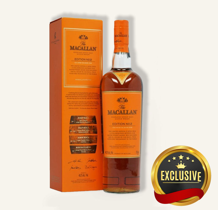 A bit lighter than other bottles from this distillery, The Macallan Edition No. 2 has a sweet aroma of vanilla, apple and ginger. The palate brings more warmth, with hints of cracked black pepper and silky richness throughout, leading to a long and smooth finish filled with brown sugar, nutmeg, and a touch of chocolate.