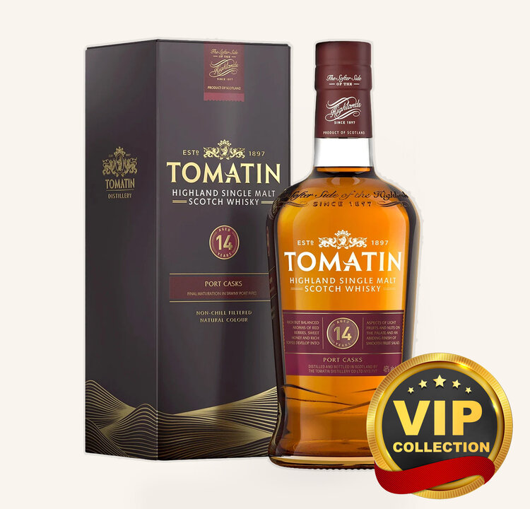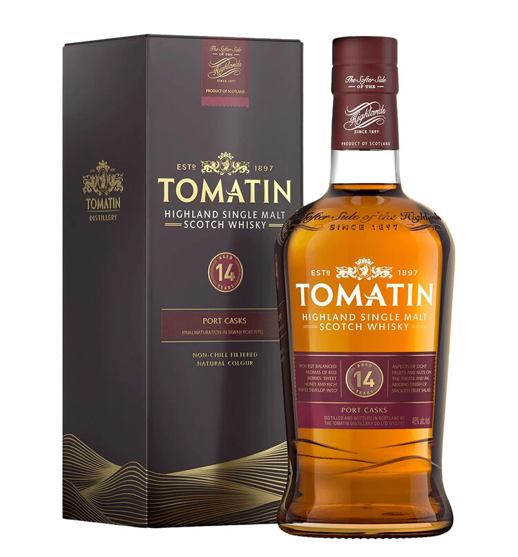 The Tomatin 14-Year-Old is soft, smooth and sweet, benefiting from its time spent in Tawny Port casks which previously held port for around 50 years. Rich but balanced aromas of red berries, sweet honey and rich toffee develop into aspects of light fruits and nuts on the palate and an abiding finish of smooth fruit salad.