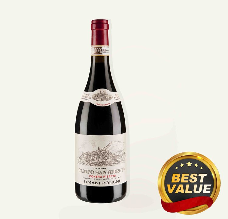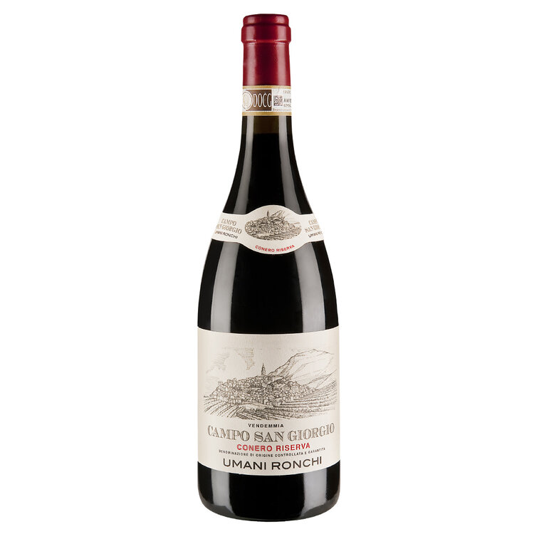 **Umani Ronchi Conero Riserva Campo San Giorgio 2019** is the pinnacle expression of Montepulciano from the Conero area, and the most important project in Umani Ronchi's long history with this noble varietal. Sourced from a single parcel of land in the municipality of Osimo, clearly marked on the label, this wine is the result of meticulous experimentation and dedication to terroir. The label’s design pays homage to the family’s winemaking heritage, echoing the aesthetic of Rosso Conero bottles from the 1970s and depicting the surrounding landscape of Camerano and Mount Conero. Crafted with care, the wine undergoes malolactic fermentation followed by 12 months of aging in small barrels and another 12 months in large casks. It is neither fined nor filtered, and matures an additional 8–10 months in bottle to achieve its full complexity and refinement.