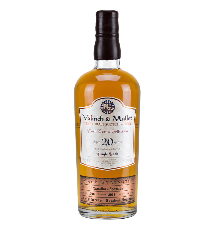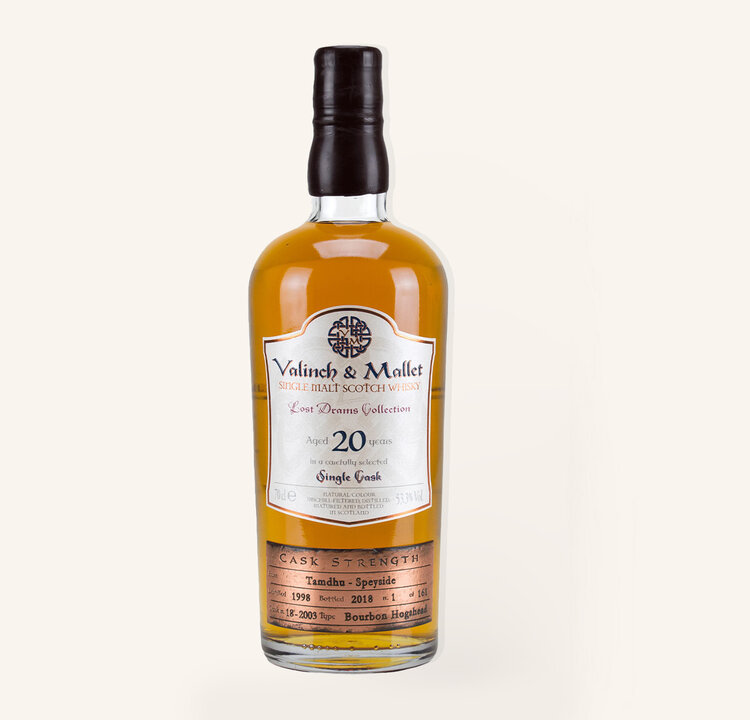 Valinch & Mallet’s Tamdhu 20-Year-Old 1998 Single Cask is a distinguished Speyside single malt that exemplifies the independent bottler’s commitment to showcasing unique and expressive whiskies. Distilled at the historic Tamdhu Distillery—renowned for its sherry-cask maturation and traditional floor malting—this expression was drawn from a single bourbon hogshead (cask #18-2003) and bottled in 2018 at a natural cask strength of 53.3% ABV, yielding only 161 bottles. Part of Valinch & Mallet’s “Lost Drams Collection,” it offers a rare glimpse into the nuanced character of Tamdhu’s spirit when aged in ex-bourbon wood, diverging from the distillery’s typical sherry-led profile.